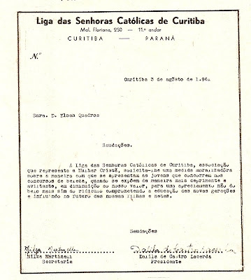 A Liga das Senhoras Católicas de Curitiba, associação que representa a Mulher Cristã, solicita-lhe uma medida moralizadora sobre a maneira com que se apresentam as jovens que concorrem aos concursos de beleza, quando se expõem da maneira mais deprimente e aviltante, em diminuição ao nosso valor, para um apreciamento não do belo mais sim do ridículo comprometendo a educação das novas gerações e influindo no futuro das nossas filhas e netas.