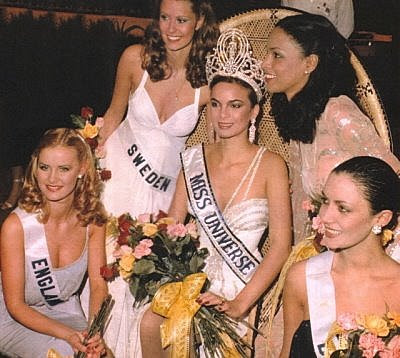 As cinco finalistas do Miss Universo 1979. Da esquerda para a direita, Anette Marie Ekström, Miss Suécia, quinto lugar; Carolyn Ann Seaward, Miss Inglaterra, terceira colocada; Marta Jussara da Costa, Miss Brasil, quarto lugar; Gina Ann Casandra Swainson, Miss Bermudas, segundo lugar; e Maritza Sayalero Fernández, Miss Venezuela, primeira colocada.